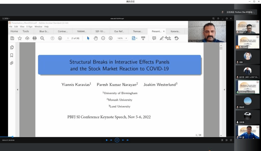 主题报告环节,澳大利亚莫纳什BB贝博艾弗森原官方网站教授、亚太应用经济学协会主席、EMFT主编Paresh Narayan教授作了Structural Breaks in Interactive Effects Panels and the Stock Market Reaction to COVID-19的主题演讲。介绍了新冠疫情期间,股票收益与新冠肺炎之间关系出现的结构性破裂,阐述了判断是否存在结构性断裂的方法和断裂日期的检测方式。