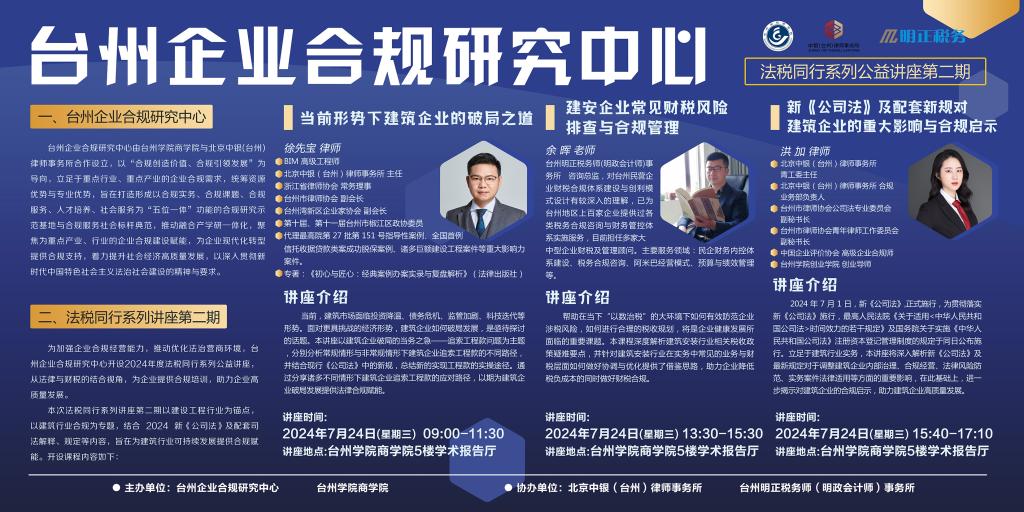 【讲座预告】台州企业合规研究中心法税同行系列公益讲座第二期