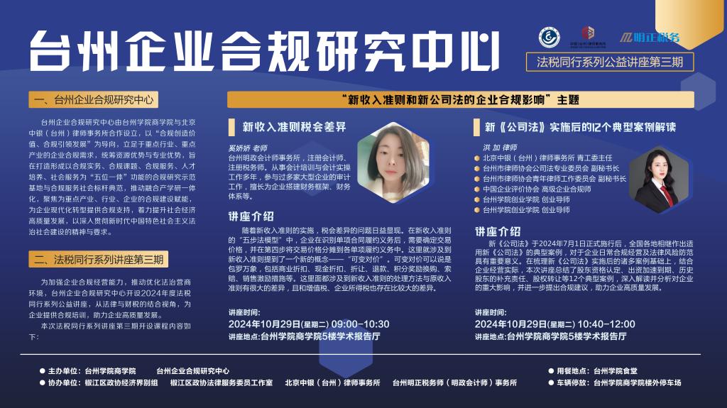 【讲座预告】台州企业合规研究中心法税同行系列公益讲座第三期