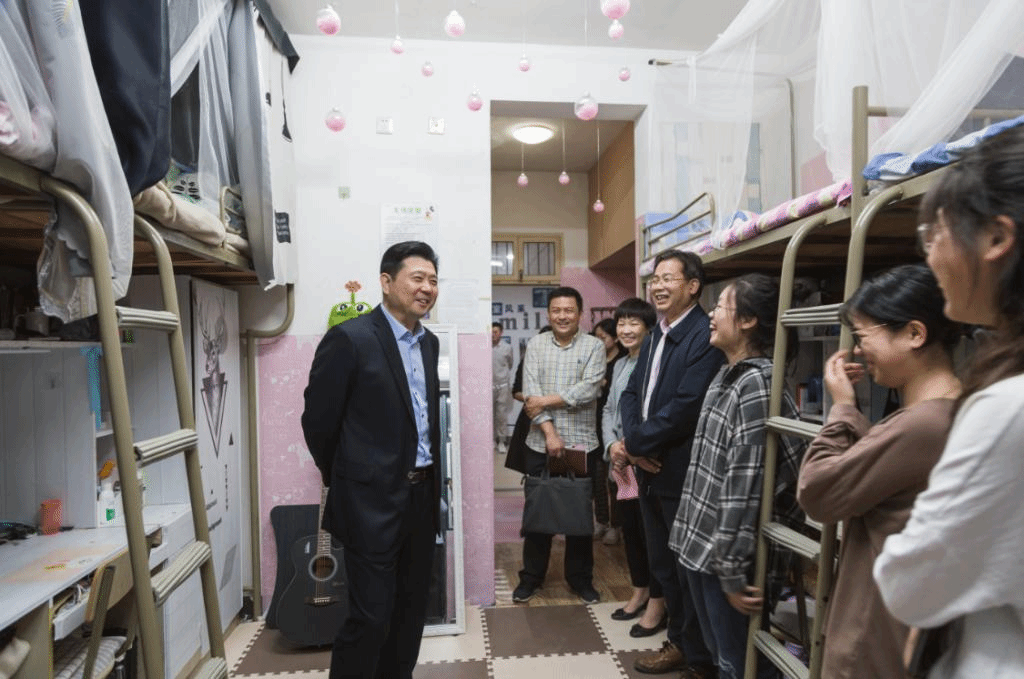 走访寝室,了解实情。交流开始前,崔书记在旅游管理专业同学的讲解下,参观了学院楼道文化和部分寝室,他为榜样上墙、书香寝室的氛围营造点赞,他强调,寝室是校园文化中的重要组成,要推进校园文化建设像空气、阳光一样润物无声。