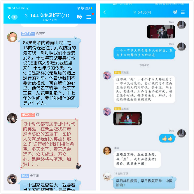 课后,大家纷纷表达了对本次大课及内容的想法。16财管12班李红亮表示“在观看了全国大学生同上一堂疫情防控思政大课后,我们都深化了理论知识,更感受到党和国家始终如一的把人民利益高于一切贯彻在行动中,把人民群众的安全和身体健康放在第一位”;17工商吴添奇表示,在听完这次思政课后,他将决定做到“注意日常学习生活中的个人防护,勤洗手、戴口罩,保护自己、保护他人;合理运用闲暇时间,积极思考不足,将更多精力投入到学习专业知识、增强自身能力上”;19国贸应怡玟感慨“这次疫情不可控因素太多,只有坚定跟着党的指挥,心怀同一个中国梦,才能看到胜利的曙光”。18金融班则倡议,“大写的青春:胸有大志、心有大我 、肩有大任 、行有大德!我们作为大学生,在这个非常时期,每一个人都应担负起一份使命,做防疫科学知识的传播者,坚定信心,不造谣、不信谣、不传谣,坚决执行党委政府的各项措施。”