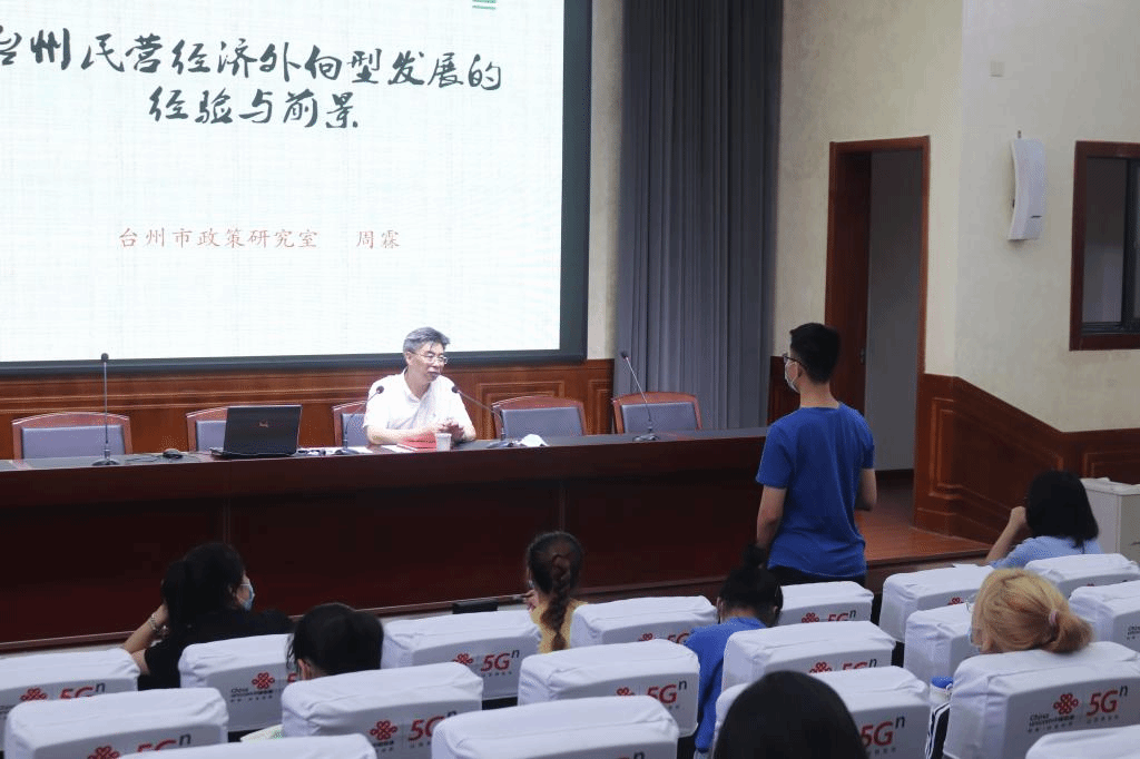 周主任带领学生回顾了国际贸易数百年来的发展历程,对各个历史时期的国际贸易理论进行了讲解,并且深度剖析了台州民营经济发展的原因及区位优势,由理论谈至实践,由浅度渐入深度;理论不是真理,是方法,实践出真知,在将理论与台州民营企业发展实际结合后,周主任提出,台州民营经济的发展离不开一代代具有极高企业家素质,具备企业家精神的老台州人,我们作为新一代国贸人更应该立足于理论知识而不被其束缚,将台州外向型民营经济发展壮大的任务肩负起来。