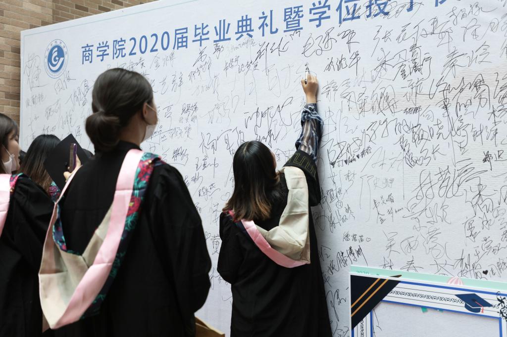 伴随着庄严的国歌,毕业典礼正式开始。首先,周全宝书记宣读2020届省优、校优毕业生文件;校、院领导们上台为冯婷亭等16名省优毕业生代表颁奖。随后,校友联络大使聘任仪式举行,各班班主任们亲手为班级校友联络大使颁发聘书,并希望大家能充分发挥自身作用,当好校友与母校之间的桥梁。在学位授予仪式环节中,崔凤军书记亲自为学士学位获得者代表拨穗,颁发学士学位证书并赠书合影留恋,给予毕业生拥抱和鼓励。