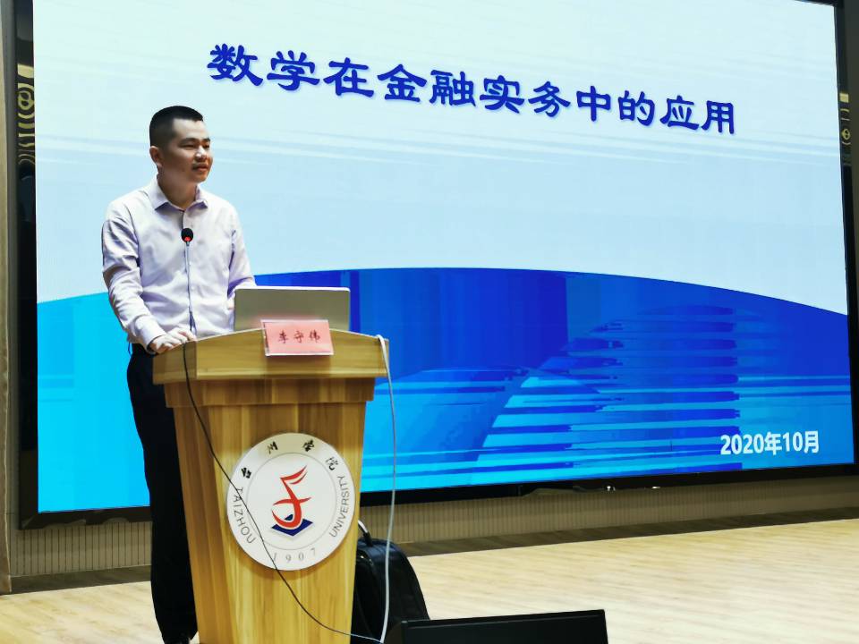 10月10日下午,申万宏源证券风险管理总部总经理助理、证券投资委员会委员李守伟先生为BB贝博艾弗森原官方网站金融学专业全体师生作“数学在金融实务中的应用”学术报告,BB贝博艾弗森原官方网站副院长陈国栋出席报告会。