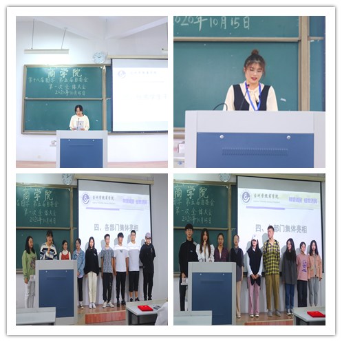 大会伊始,学院举行了受聘仪式,为各位新上任的学生干部颁发聘书,以肯定他们为学院的学生工作做出的贡献,并鼓励他们继续砥砺前行。随后,程子良作为教师代表进行了发言,提出了学生干部要有服务意识、责任意识、团队意识和大局意识;优秀学生干部曹泸元和苏欣璐通过回顾过往的经历,分享了“恭谦做人、积极做事”经验。会议同时,各部门成员进行了集体亮相,以增进部门间成员的相互熟悉。