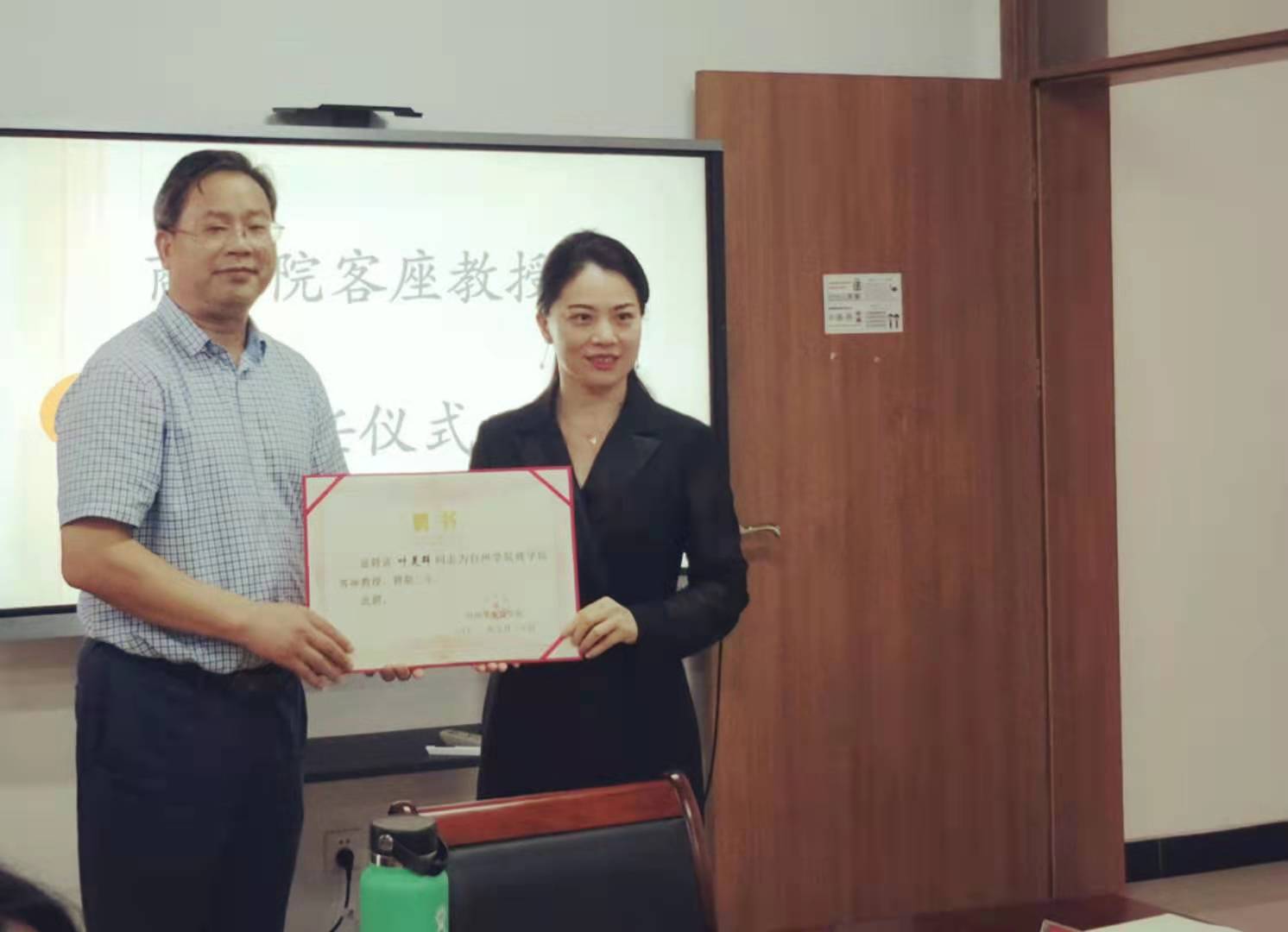实践基地签约仪式后,进行客座教授的聘任仪式。我院聘请陈春芳和叶灵超为旅游管理专业的客座教授。