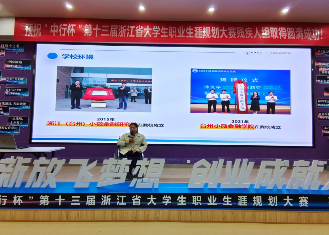 本次大赛由省教育厅、省残疾人联合会主办,省教育发展中心、省残疾人就业服务指导中心、浙江特殊教育职业学院承办。全省共有来自33所高校的79名残疾大学生报名参赛,前期通过书面评审共遴选出30名选手入围省级现场决赛。现场决赛由主题陈述、职业体验感悟、现场答辩三部分组成。校党委学工部、创业学院、BB贝博艾弗森原官方网站高度重视此项省级A类赛事,专门成立大赛指导团队。陈苗苗同学以《轮椅上的梦想——小微金融助梦师》为题,结合台州小微金融服务特色展开自己的职业理想陈述。她身残志坚、顽强拼搏求学的经历,积极阳光、渴望回报社会的情怀深深打动了评委,最终以全场最高分获得大赛一等奖,同时兼获最佳答辩奖。