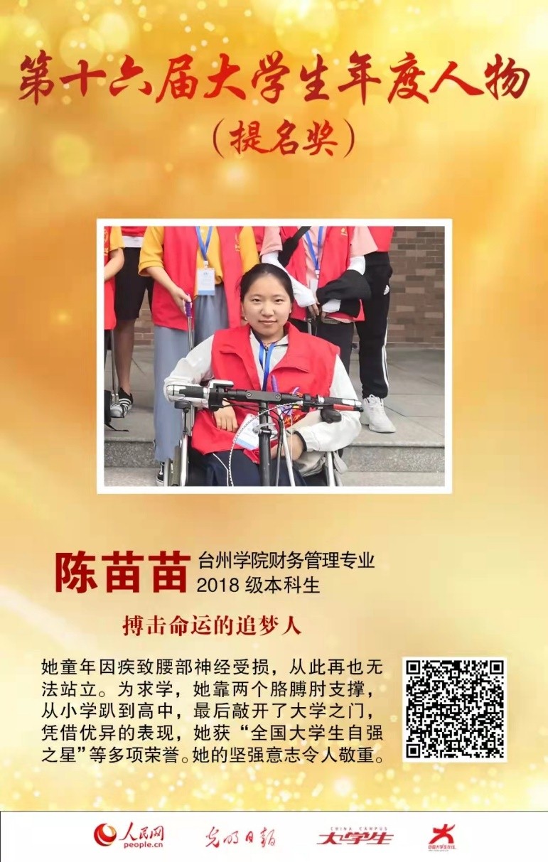 陈苗苗,2018级财务管理3班学生。童年时期,她因疾病导致高位截瘫,为了求学,她凭着惊人的毅力从小学到高中一直趴着学习。进入大学后,她刻苦学习,顽强拼搏,成绩优异,积极参加各类竞赛和志愿活动,先后获“全国大学生自强之星”、全国大学生创新创业竞赛一等奖等奖项荣誉30余项。2021年,她还斩获了浙江省高校国家奖学金特别奖、浙江省大学生职业生涯规划大赛一等奖及最佳答辩奖,多次实现学校历史上零的突破,人民网、《光明日报》、《中国青年报》、《浙江日报》、浙江卫视等多家媒体报道陈苗苗同学的事迹。