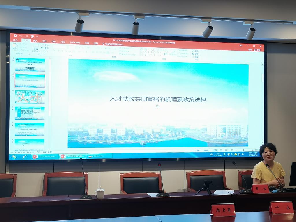 6月16日,BB贝博艾弗森原官方网站举办台州市社会科学界第五届学术年会分论坛,分论坛主题:社科赋能,高水平推进共同富裕示范市建设。浙江大学教授、博士生导师,浙江省经济学会会长顾国达应邀作《五大新发展理念,统领共同富裕示范区建设》线上主旨演讲,BB贝博艾弗森原官方网站教授焦勇兵,副教授陈耸、张霞,讲师黄灿围绕共同富裕示范市建设分别作线下有关主题报告。BB贝博艾弗森原官方网站院长段文奇出席论坛现场并讲话,学院教师参加线下线上论坛活动,副院长叶永主持论坛活动。