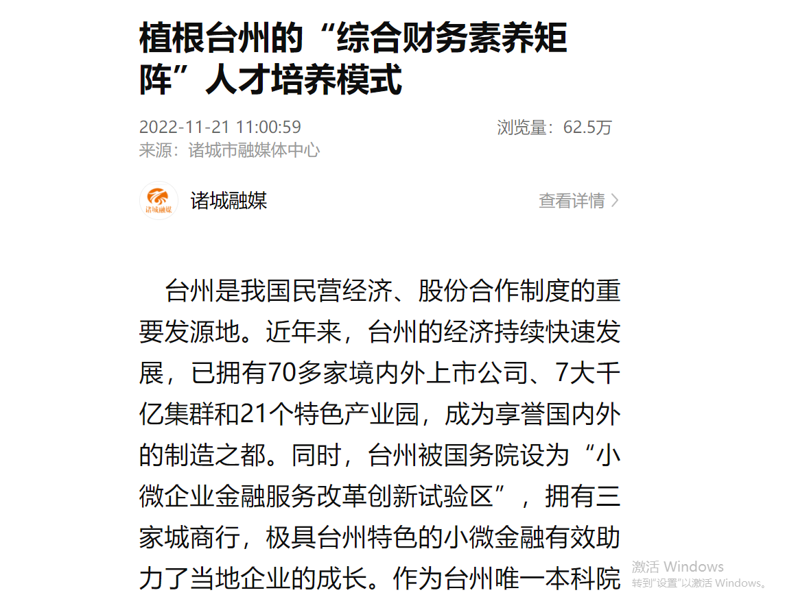 在这种指导思想下,我们开始更加坚定地植根台州,打台州牌,将专业的发展融入地方和学校发展大局之中,将学生综合财务素养的提升,融入到台州的企业、社会和文化之中。
