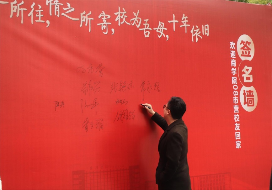 在“欢迎BB贝博艾弗森原官方网站校友回家”的路标指引下,08市营返校师生齐聚签名墙,或严肃认真、或轻快自在地写下自己的名字。一个个名字仿佛一张张笑脸在脑海浮现,往日在教室一起认真上课的场景,在球场一起挥洒青春汗水的场景,在校园一起漫步畅聊的场景渐渐冲破记忆的闸门,成为今日津津乐道的故事。