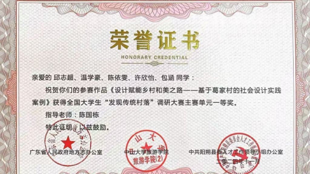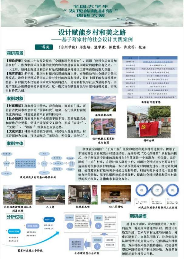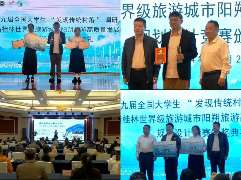 第九届全国大学生“发现传统村落”调研大赛暨打造桂林世界级旅游城市阳朔旅游高质量发展先导区规划设计竞赛于2024年6月正式拉开帷幕,鼓励青年学生响应国家乡村振兴战略的号召,推动优秀传统文化保护与传承,号召青年人才回到家乡、深入乡土,通过自己的调研和创意,赋予传统村落新的青春活力和发展契机。大赛组委会共收到来自全国187所高校的275份作品,参赛作品涉及全国26个省份的271个传统村落。经过三轮评选,此次大赛共评选出主赛单元优秀参赛作品30份,专项单元优秀参赛作品9份,13位优秀指导老师以及13个优秀组织奖。我院设计赋能实践队提交的作品《设计赋能乡村和美之路——基于葛家村的社会设计实践案例》荣获一等奖,陈国栋获优秀指导老师,我院获优秀组织。