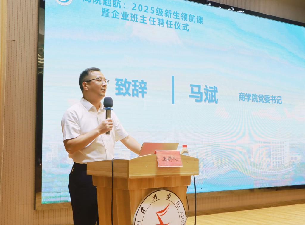 为助力2025级新生开启大学新篇章,深化校企协同育人机制,9月17日晚,BB贝博艾弗森原官方网站在大学生活动中心隆重举办2025级新生领航课暨企业班主任聘任仪式。本次活动汇聚业界精英与学界力量,共同为新生的成长成才注入强劲动力。BB贝博艾弗森原官方网站党委书记马斌、副书记陈斌岚、企业班主任、系主任、班主任、辅导员及2025级新生参加活动。