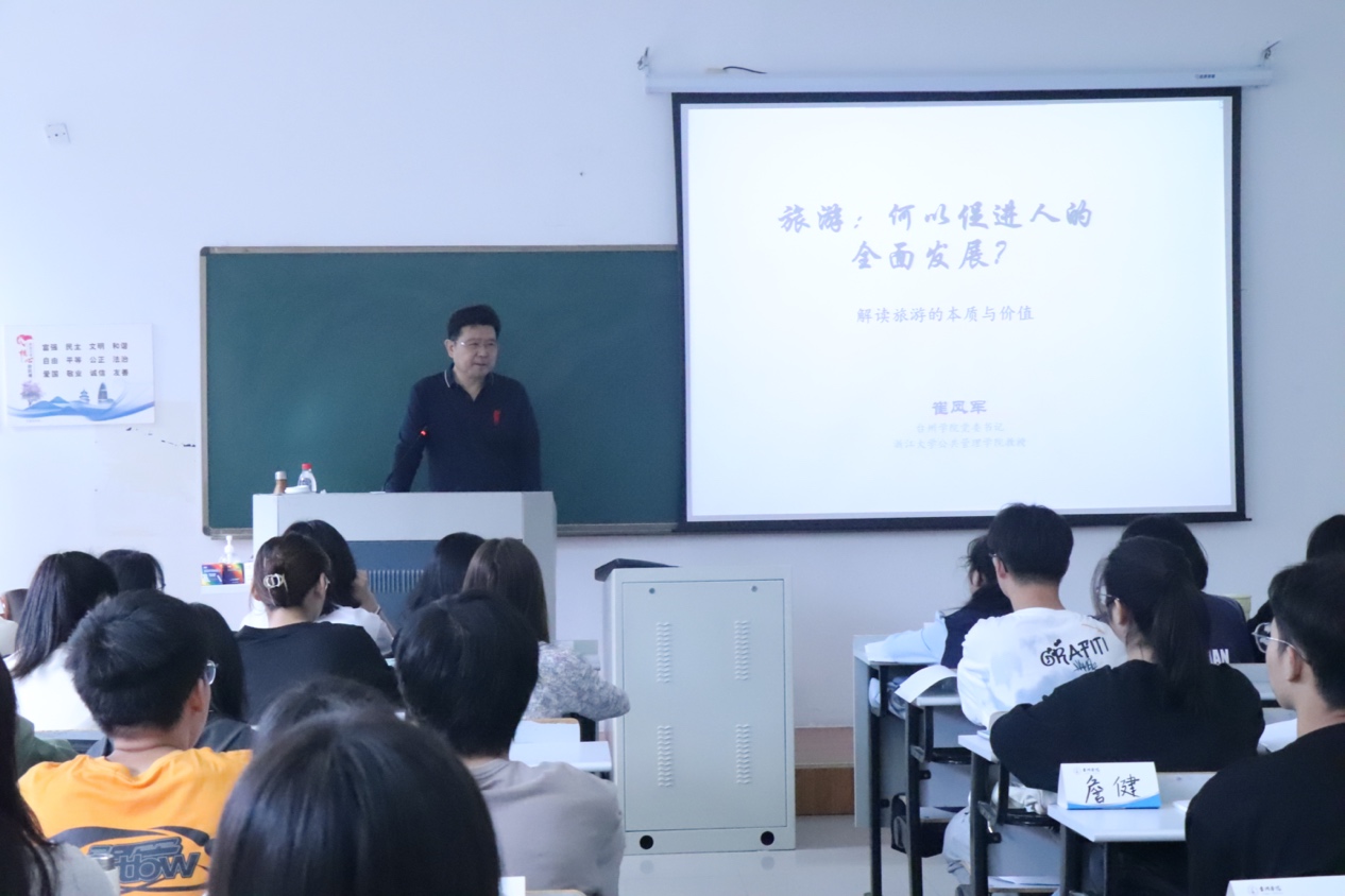 10月22日,校党委书记崔凤军应邀为22旅游管理专业学生讲授《专业导论与规划》课程。