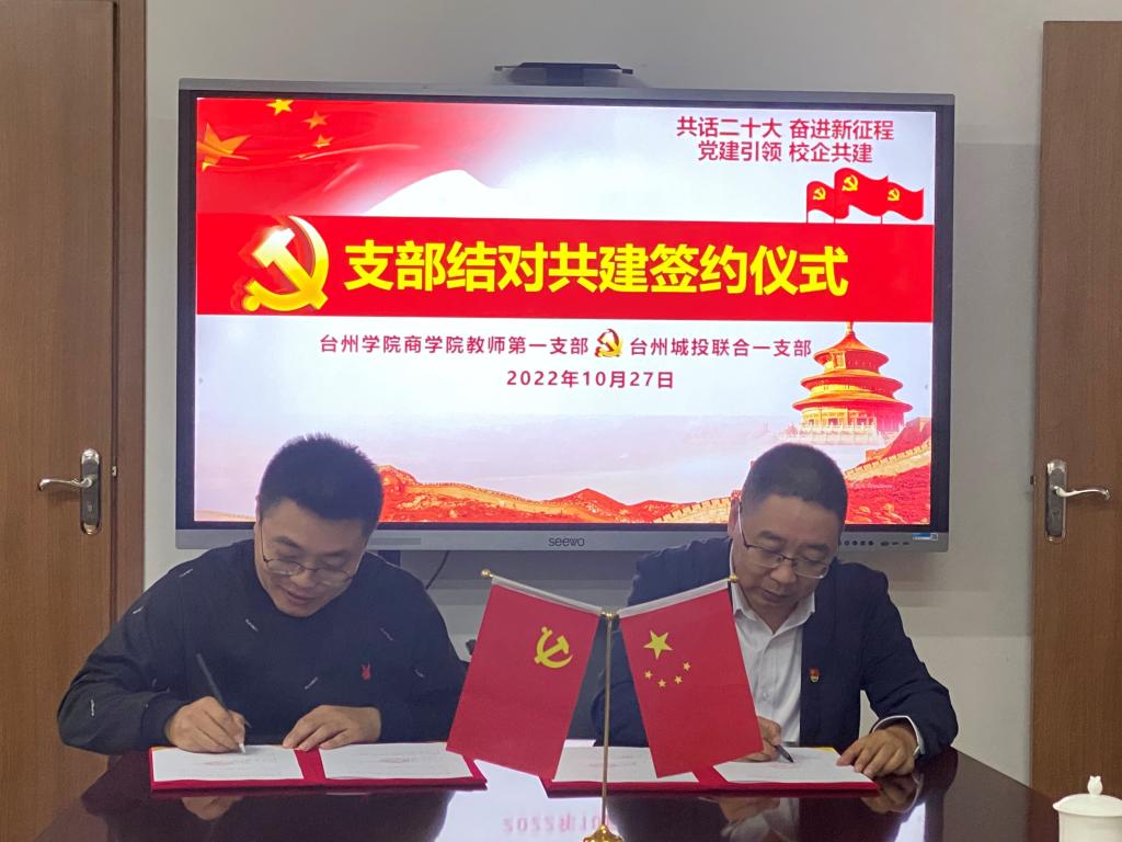 习近平总书记在二十大报告中强调,深入推进新时代党的建设新的伟大工程,同时强调,团结就是力量,团结才能胜利。为进一步落实新时代党的建设总要求,实现校企共建双方资源共享、深度联合,充分发挥社会力量在提升高校党建工作质量中的作用,积极引导和鼓励教师党员走向社会、职工党员走进高校,有效互动提升共建双方党员的幸福感和获得感,10月27日下午,BB贝博艾弗森原官方网站教师第一支部与台州城投联合一支部党建共建签约仪式在BB贝博艾弗森原官方网站三楼会议室举行。