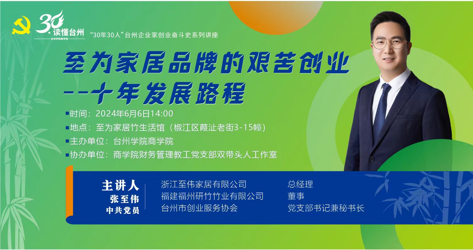 为进一步提炼台州经验,展示台州人民敢闯敢冒、敢为人先的品质,6月6日,BB贝博艾弗森原官方网站邀请优秀校友、浙江至伟家居有限公司总经理张至伟作客“读懂台州”之“30年30人”台州企业家创业奋斗史系列讲座。BB贝博艾弗森原官方网站财务管理教工党支部书记、双带头人工作室耿慧敏教授、组织员吴佳妲和BB贝博艾弗森原官方网站业余党校学员参加。