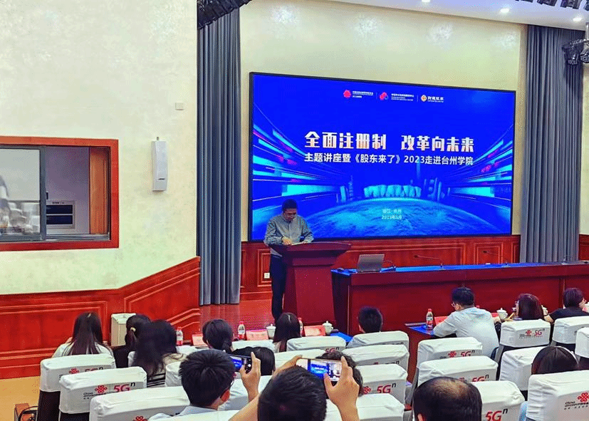 在讲座开始前,来自财通证券总部的葛子微介绍2023《股东来了》投资者权益知识竞赛活动详情。《股东来了》这个活动是中国证监会投资者保护局为指导单位,中证中小投资者服务中心联合地方监管局共同主办、协会协办、券商承办,各市场主体共同参与,以多个赛区覆盖全国及港澳台地区的投资者权益知识大赛。大赛旨在进一步落实证监会党委关于资本市场人民性监管要求,切实履行保护投资者合法权益的职责,实实在在地保护投资者的钱袋子。通过两天的设点宣传,近千名师生报名参赛,期待大家在竞赛中增长才干,收获知识与技能。走进BB贝博艾弗森原官方网站是“全面注册制,改革向未来”暨《股东来了》2023投资者权益知识竞赛在台州高校的唯一一次宣讲,宣讲会现场有浙江省证监局、台州市银保监分局、浙江证券业协会、台州市金融办、财通证券台州分公司相关负责人,BB贝博艾弗森原官方网站党委书记马斌代表学院出席了本次活动。