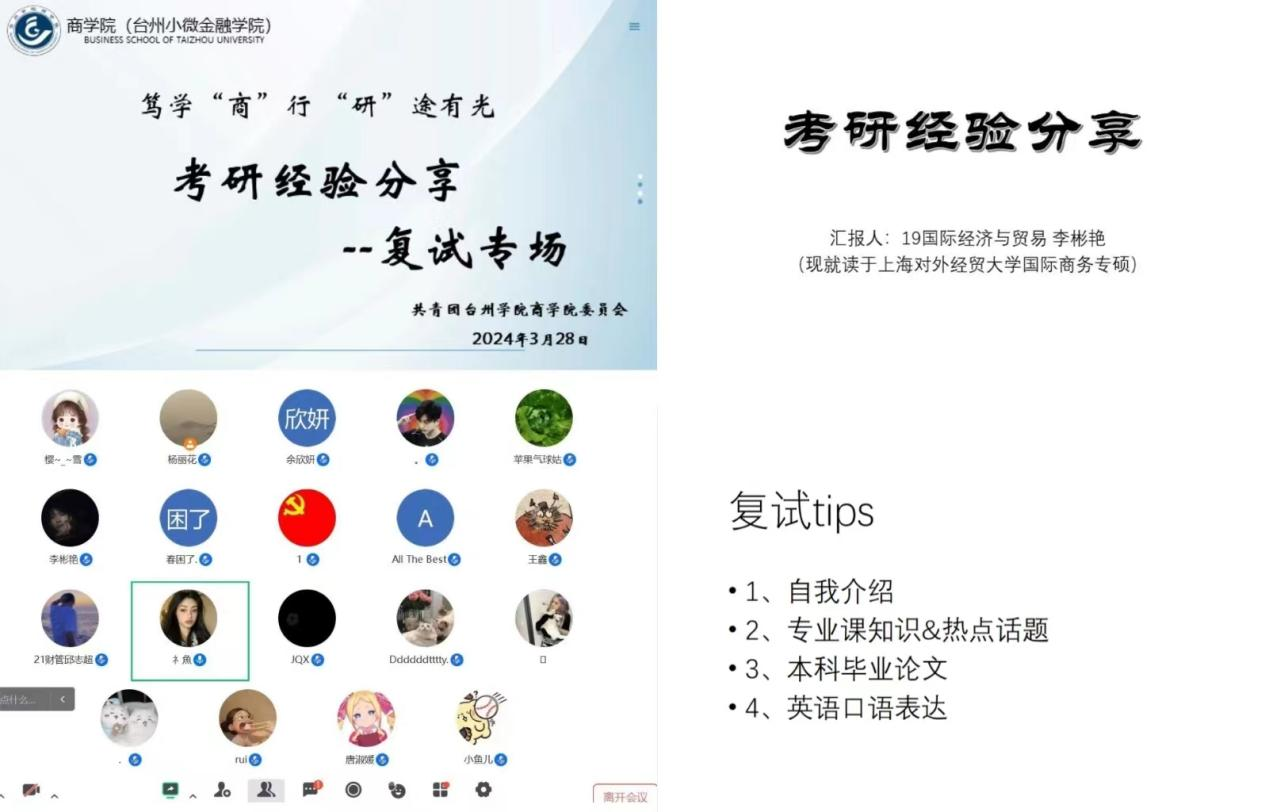 为帮助学生全力备战考研复试、精准规划考研路径,BB贝博艾弗森原官方网站于3月28日开展笃学“商”行“研”途有光考研经验分享系列活动。两场活动分别邀请“印校园”考研服务中心张老师进行院校专业选择专题讲座,2023届毕业生李彬艳和曹瑜嘉做考研复试专场分享,辅导员及2024届考研学生、2025届意向考研学生参加活动。