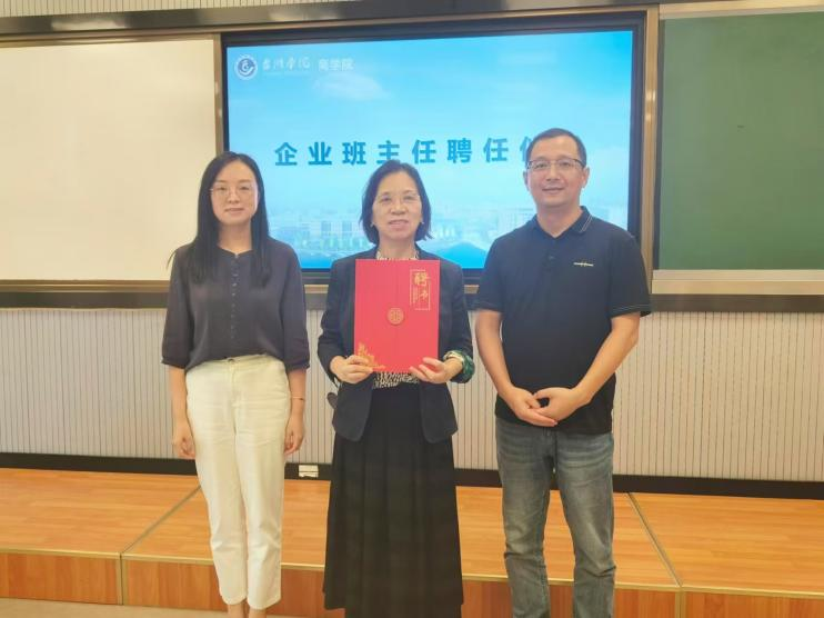 见面会上,马书记和陈书记为林老师、蒋老师颁发企业班主任聘书,在仪式感中加深学校与企业的联结。随后,企业班主任做主题报告,为同学们指明未来方向。