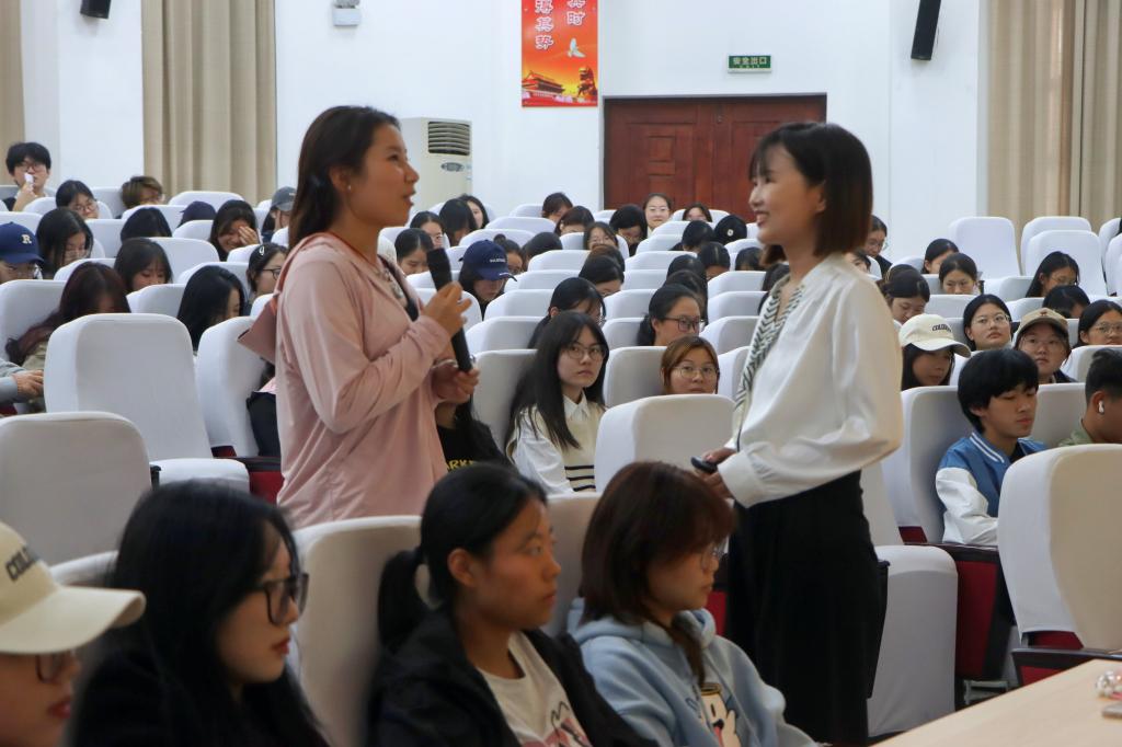 王蕴瑾老师从询问同学们的大学感受与挑战出发,用热身小游戏进入主题,同学们与王老师积极互动,反响热烈。王老师倾听学生的困惑,并通过播放的短视频和动画,教育同学们应正确看待心理问题,重新建构来自他人的评价,积极发现属于自己的闪闪发光的自信点。同时,王老师也用自己的亲身经历分享了自己学习生涯中遇到的困境与解决方法,引发了同学们的情感共鸣。最后,王老师呼吁同学们应关注心理健康,积极乐观地面对未来大学生活,也为日后同学们的心理需求提供了心理咨询的方式和渠道。活动全程师生氛围融洽,掌声雷动。