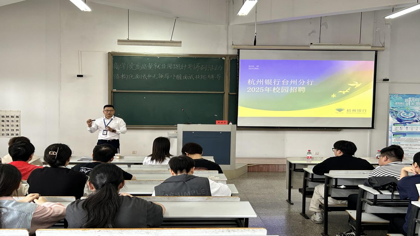 为扎实推进毕业生就业工作,提高学生在求职中的自信心和竞争力,10月10日,BB贝博艾弗森原官方网站特邀杭州银行台州分行人力资源部总经理张建平、浦发银行宁波分行团委书记李奕欣、温州银行台州分行办公室主任陈安、招商银行台州分行人力资源高级经理唐恒蕾、台州市人力资源协会执行秘书长柏余红等作招聘宣讲及就业指导。BB贝博艾弗森原官方网站党委副书记陈斌岚出席活动。BB贝博艾弗森原官方网站就业辅导员赵之遐主持,2025届毕业生积极参加。