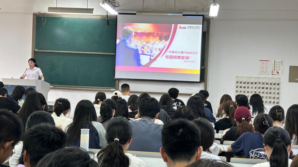 为丰富学生对金融业的认识,增加就业机会,10月17日,BB贝博艾弗森原官方网站联合校就业协会,特邀中国光大银行台州支行办公室人事经理徐王者走进校园,作招聘宣讲及就业指导。此次活动主要面向大三、大四学生。