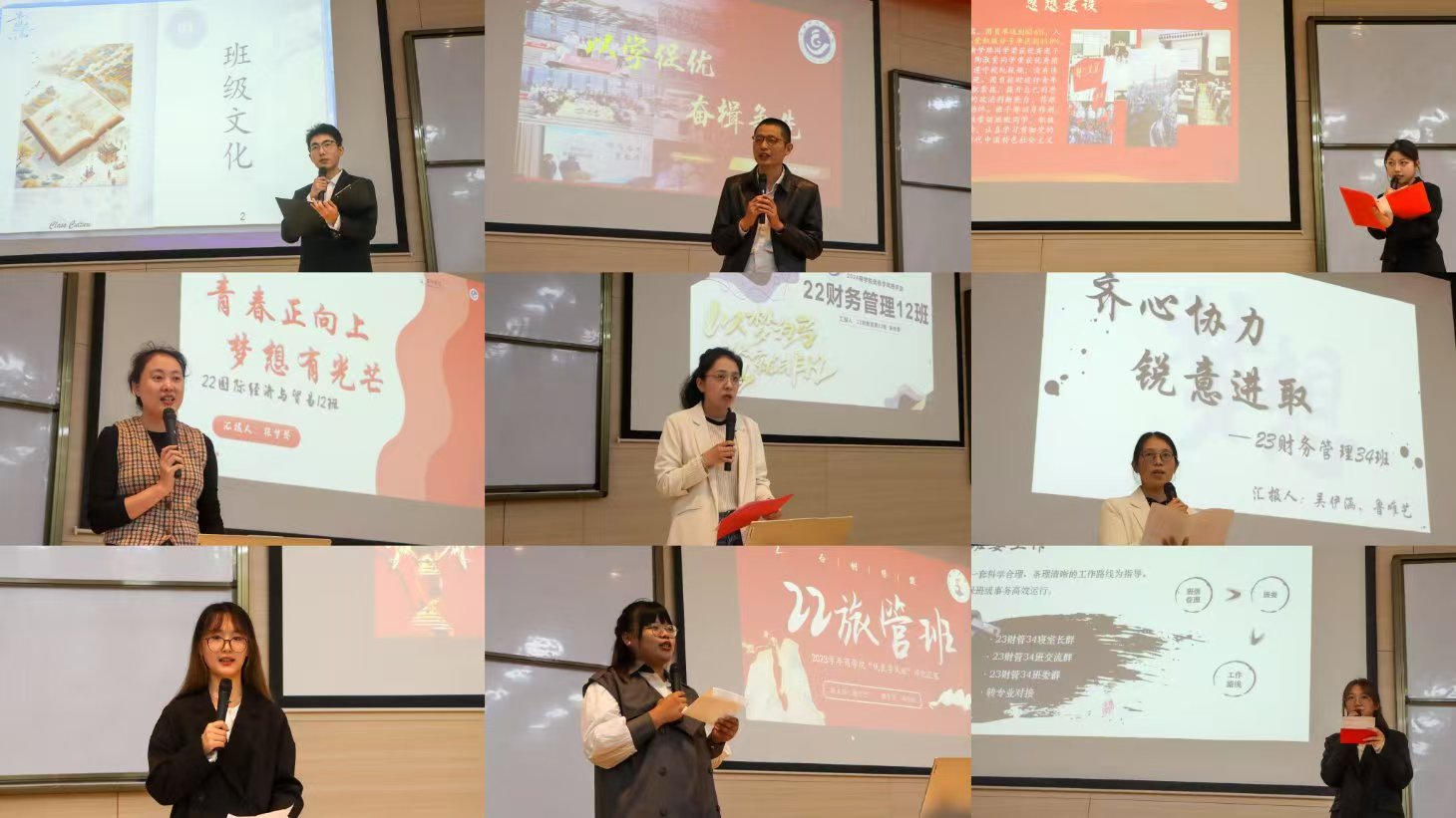 此次评选共有12个班级参与,按照抽签顺序依次上台发言。评选会现场,各班班主任先向评委与观众推荐自己的班级,随后由各班代表从“班团建设”、“学风建设”、“社会实践”、“未来展望”等方面进行五分钟的班级介绍。他们以落落大方的姿态阐述了班级竞争优势:推荐自己班级是支“优绩股”,班内自发组织专业沙龙活动等。现场同时设置大众评委投票环节。