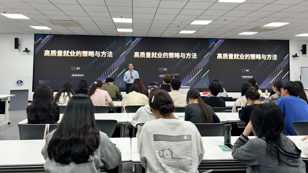 随后,马斌以《高质量就业的策略与方法》为题,结合丰富的企业走访与就业指导实践经验,为学生带来一场精彩的就业指导讲座。他通过数据揭示严峻的就业形势,指出就业市场面临“毕业生数量激增”“岗位紧缺”“结构矛盾突出”“求稳心态普遍”等多重挑战,提出“就业是一种思维方式”的观点,呼吁学生摒弃“慢就业”观望心态,主动把握机遇。针对学生普遍存在的“校园人”思维,对比“职场人”思维,马斌强调,学生应树立“择业优先、能力导向”的职业思维,破除“非白领不做”“非本专业不看”“非高薪不瞧”“非大型企业不去”“非大城市不留”等五大就业误区。以职场需求反推大学期间的知识储备与能力培养。围绕“如何实现高质量就业”,马斌提出系统性策略:在目标规划上,建立“一线多途”备考思维,合理制定计划;在能力提升上,重视专业学习、学科竞赛、考级考证,同时提升诚实靠谱、吃苦耐劳、主动沟通等综合素质;在资源利用上,充分借助学院搭建的“台州HR导师团”“校企合作实习基地”“海外访学项目”“定向培养计划”,利用“六度空间理论”拓展求职人脉,重视内推等高效渠道;在心态调整上,克服迷茫、焦虑、浮躁等情绪,用行动打破“选择困境”。