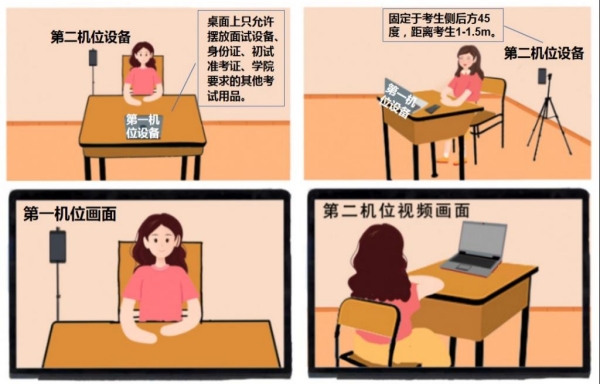 (2)面试第二机位要求。第二机位设备固定于考生侧后方45度,距离考生1-1.5m左右,需保证考生头肩部及第一机位设备的全部屏幕出现在视频画面中。用于考官和复试工作人员在面试过程中观测考生的电脑屏幕及周边环境情况(第二机位建议使用智能手机+4G/5G网络)。