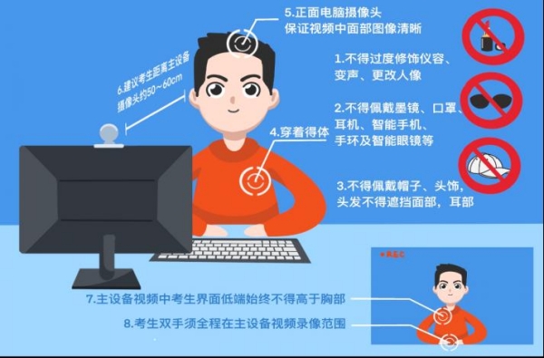 3.独立的复试房间(严禁在培训机构)。考生需确保环境封闭、明亮、安静、不逆光,房门在可视范围内并处于关闭状态。考生须面向墙壁而坐,房间内不得放置任何与考试无关的物品。“双机位”涉及的硬件设备的电脑桌面以及手机不得存放考试相关的电子资料。考生须提前熟悉复试流程和软件操作,确保复试全程网络稳定、畅通,视频画面清晰,音频传输流畅。