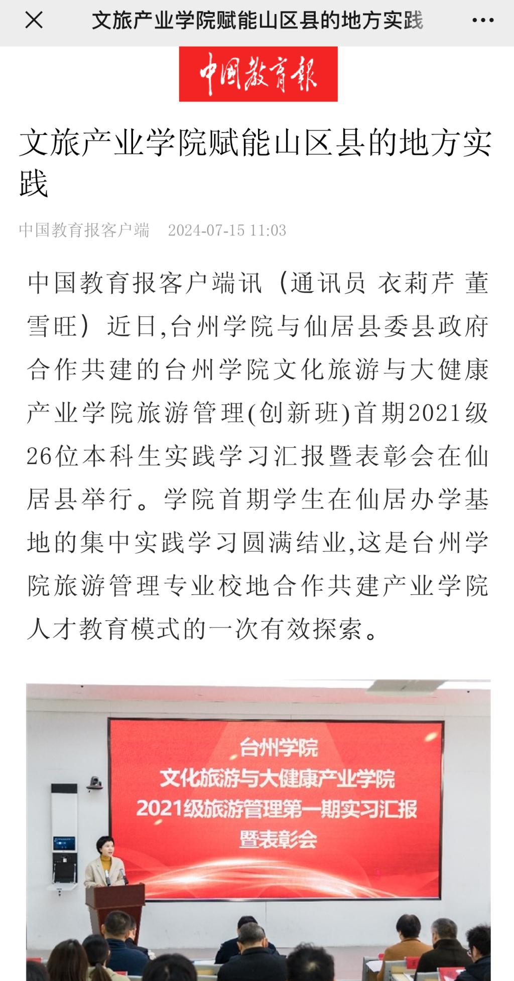 仙居县为产业学院人才培养拓展了舞台,产业学院为仙居文旅高质量发展提供了多维智力支持。BB贝博艾弗森原官方网站旅游管理专业将继续加强“政校企行、产学研用”联动,拓宽办学思路,深入把握山区县文旅高质量发展中人才需求特征和演化趋势,不断优化培养方案,迭代式构建高水准的课程体系和教育模式,通过强化思政融入、扎根实践、数智赋能、协同创新的理念,不断提升专业人才培养质量,为地方供应可用可留的高质量应用型人才,实现校地共建共荣。