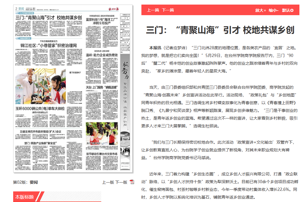 当天,由三门县委组织部和共青团三门县委员会联合BB贝博艾弗森原官方网站团委、BB贝博艾弗森原官方网站发起的“青聚山海·创赢未来”乡创宣讲活动在此举行。活动现场,“政策礼包”与“乡创地图”同青年炽热的目光相遇。三门选调生将乡村蝶变故事化为青春创意,以《青春撞上田野》脱口秀、《九景宁和笑谈录》相声等新颖路演,展现乡创多维魅力。“三门是干事创业的热土,是青年返乡创业的蓝海。希望通过这次不一样的宣讲,让大家看到乡村新貌,吸引更多人才来三门大展拳脚。”选调生杜硕说。