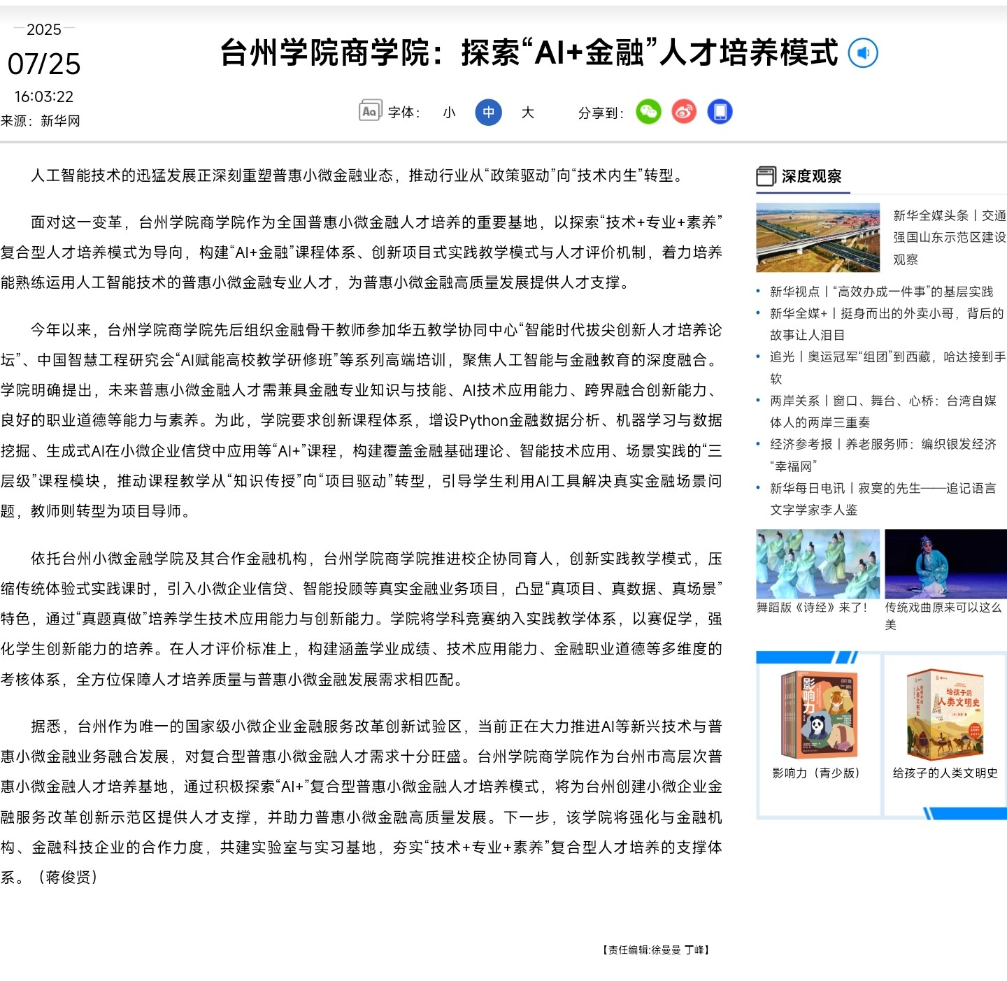 据悉,台州作为唯一的国家级小微企业金融服务改革创新试验区,当前正在大力推进AI等新兴技术与普惠小微金融业务融合发展,对复合型普惠小微金融人才需求十分旺盛。BB贝博艾弗森原官方网站作为台州市高层次普惠小微金融人才培养基地,通过积极探索“AI+”复合型普惠小微金融人才培养模式,将为台州创建小微企业金融服务改革创新示范区提供人才支撑,并助力普惠小微金融高质量发展。下一步,该学院将强化与金融机构、金融科技企业的合作力度,共建实验室与实习基地,夯实“技术+专业+素养”复合型人才培养的支撑体系。