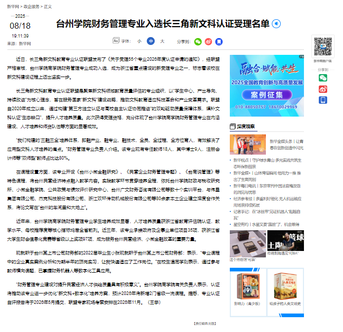 近日,长三角新文科教育专业认证联盟发布了《关于受理55个专业2026年度认证申请的通知》,经联盟严格审核,BB贝博艾弗森原官方网站财务管理专业成功入选,成为浙江省重点建设的新受理专业之一,标志着该校在新文科建设征程上迈出坚实一步。