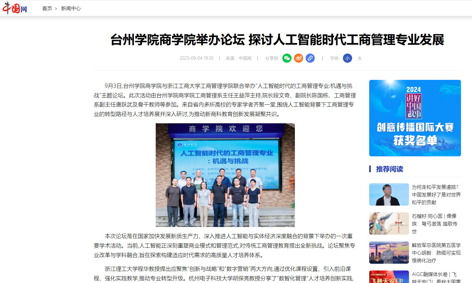 9月3日,BB贝博艾弗森原官方网站与浙江工商大学工商管理学院联合举办“人工智能时代的工商管理专业:机遇与挑战”主题论坛。此次活动由BB贝博艾弗森原官方网站工商管理系主任王益萍主持,院长段文奇、副院长陈国栋、工商管理系副主任唐跃武及骨干教师等参加。来自省内多所高校的专家学者齐聚一堂,围绕人工智能背景下工商管理专业的转型路径与人才培养展开深入研讨,为推动新商科教育创新发展凝聚共识。